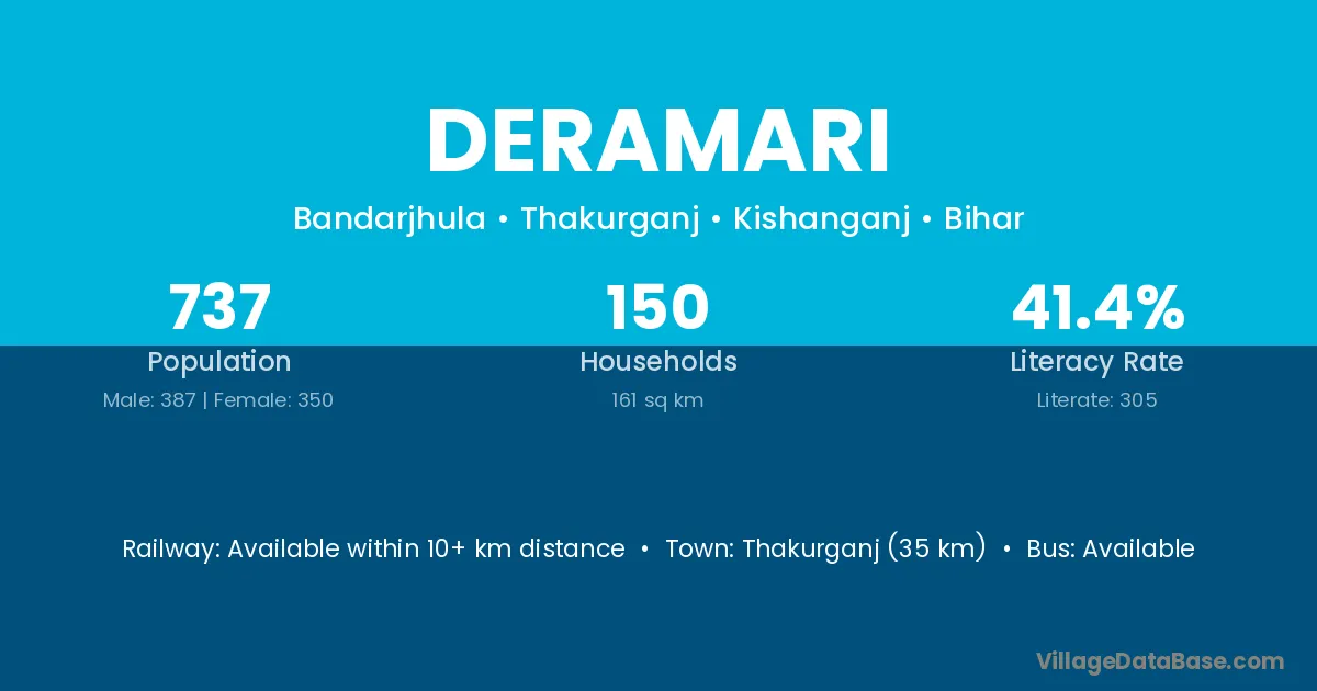 Kishanganj (12 km) is the nearest town to Deramari village for major economic activities and is located approximately 12 km away.