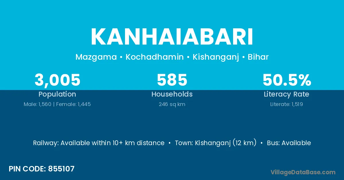 Kishanganj (12 km) is the nearest town to Kanhaiabari village for major economic activities and is located approximately 12 km away.