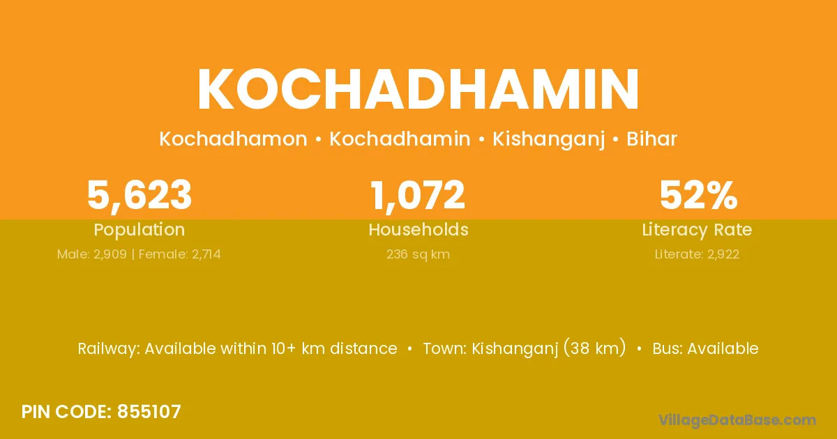 Kishanganj (38 km) is the nearest town to Kochadhamin village for major economic activities and is located approximately 38 km away.