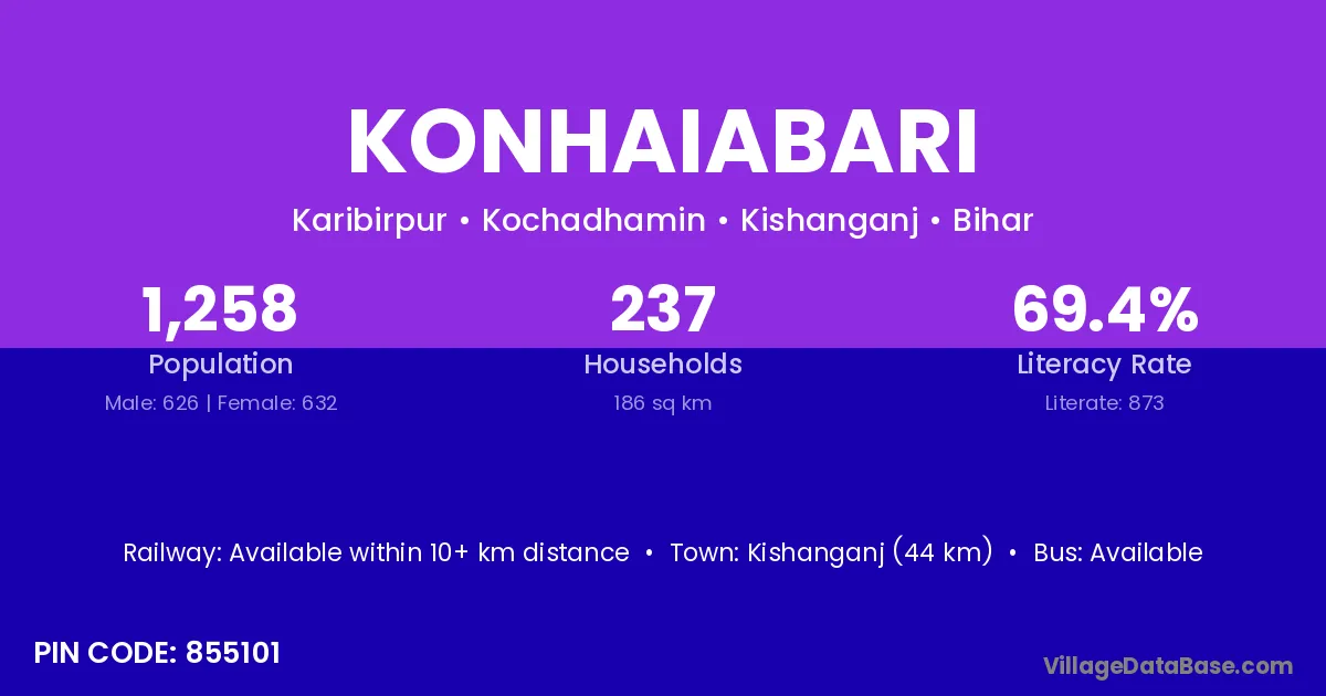 Kishanganj (44 km) is the nearest town to Konhaiabari village for major economic activities and is located approximately 44 km away.