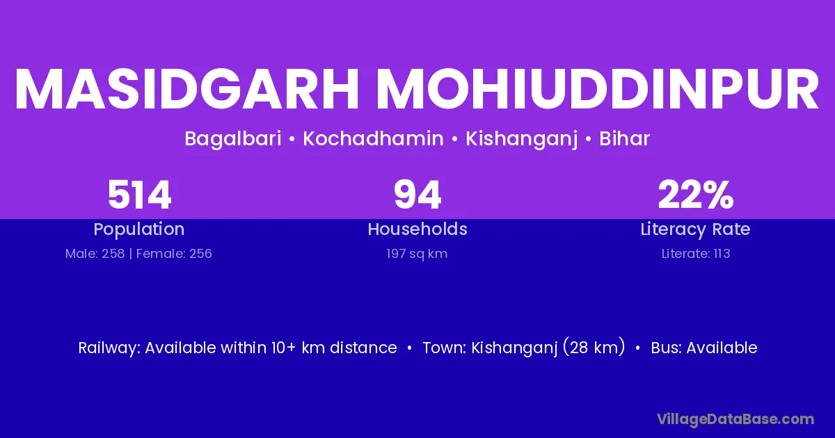 Masidgarh Mohiuddinpur village has a total population of 514 people, of which 258 are males and 256 are females.