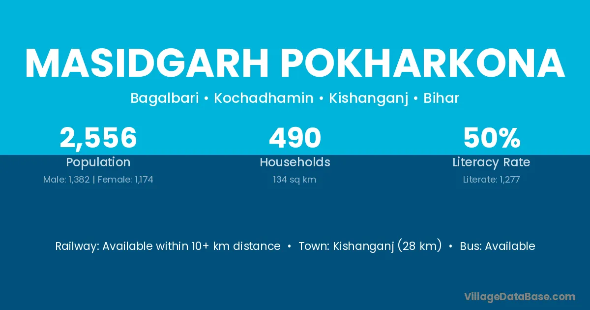 Kishanganj (28 km) is the nearest town to Masidgarh Pokharkona village for major economic activities and is located approximately 28 km away.
