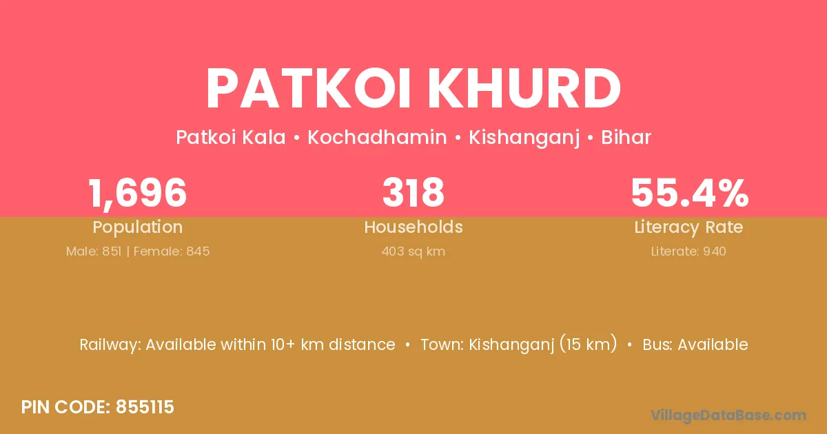 Kishanganj (15 km) is the nearest town to Patkoi Khurd village for major economic activities and is located approximately 15 km away.