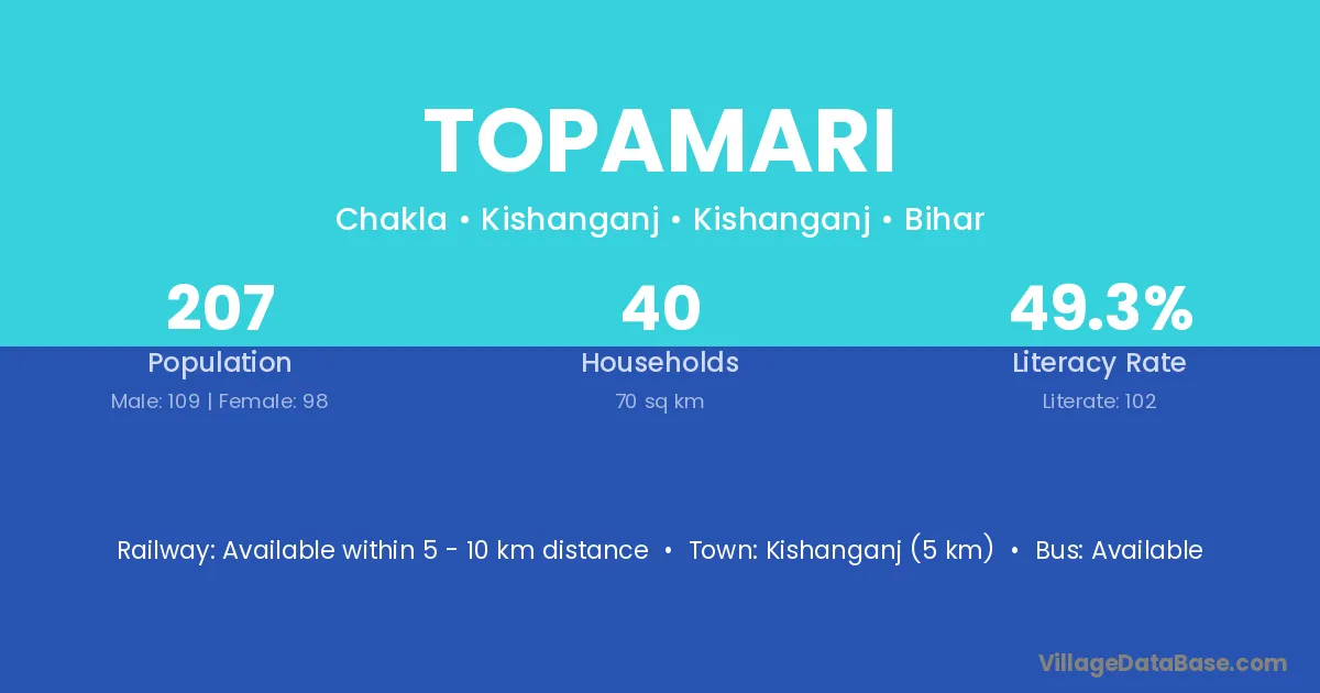 Kishanganj (36 km) is the nearest town to Topamari village for major economic activities and is located approximately 36 km away.