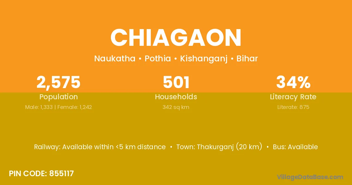 Thakurganj (20 km) is the nearest town to Chiagaon village for major economic activities and is located approximately 20 km away.