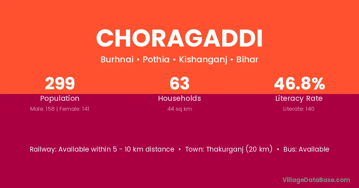 Thakurganj (20 km) is the nearest town to Choragaddi village for major economic activities and is located approximately 20 km away.
