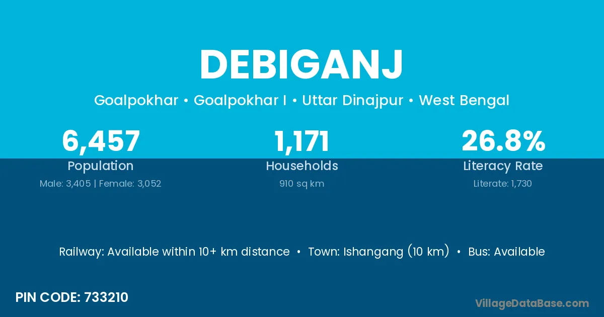 Thakurganj (20 km) is the nearest town to Debiganj village for major economic activities and is located approximately 20 km away.