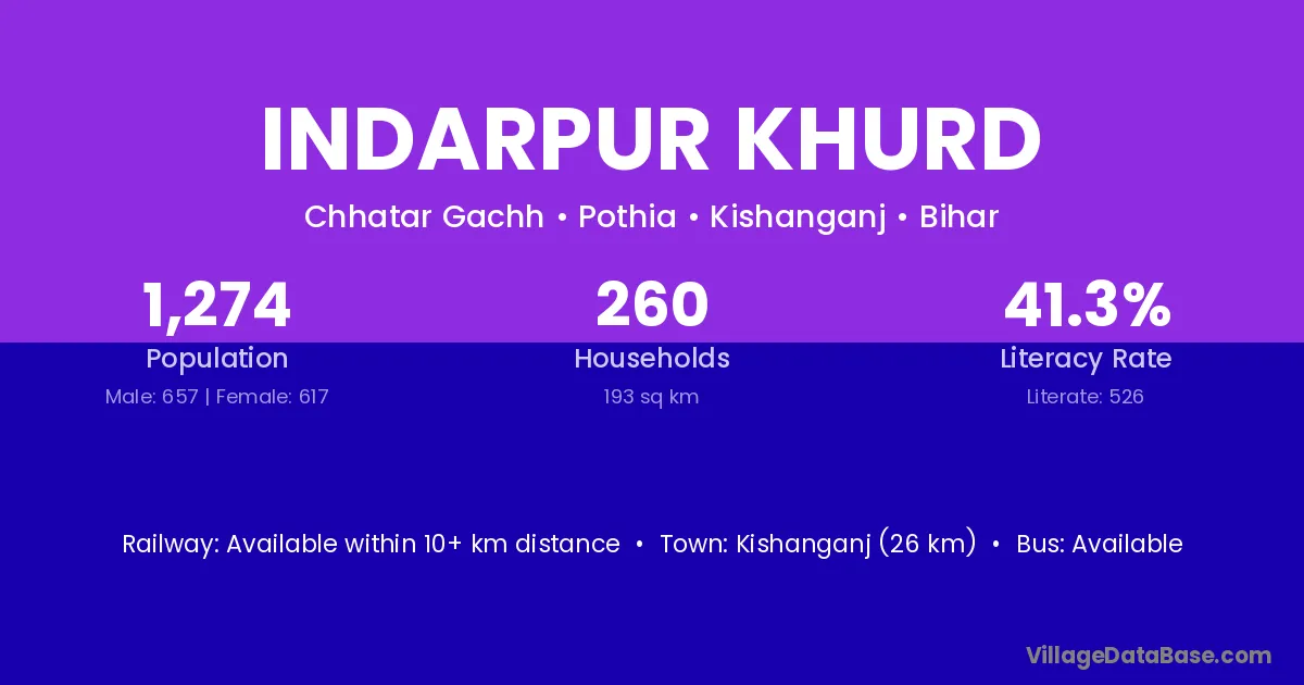 Kishanganj (26 km) is the nearest town to Indarpur Khurd village for major economic activities and is located approximately 26 km away.