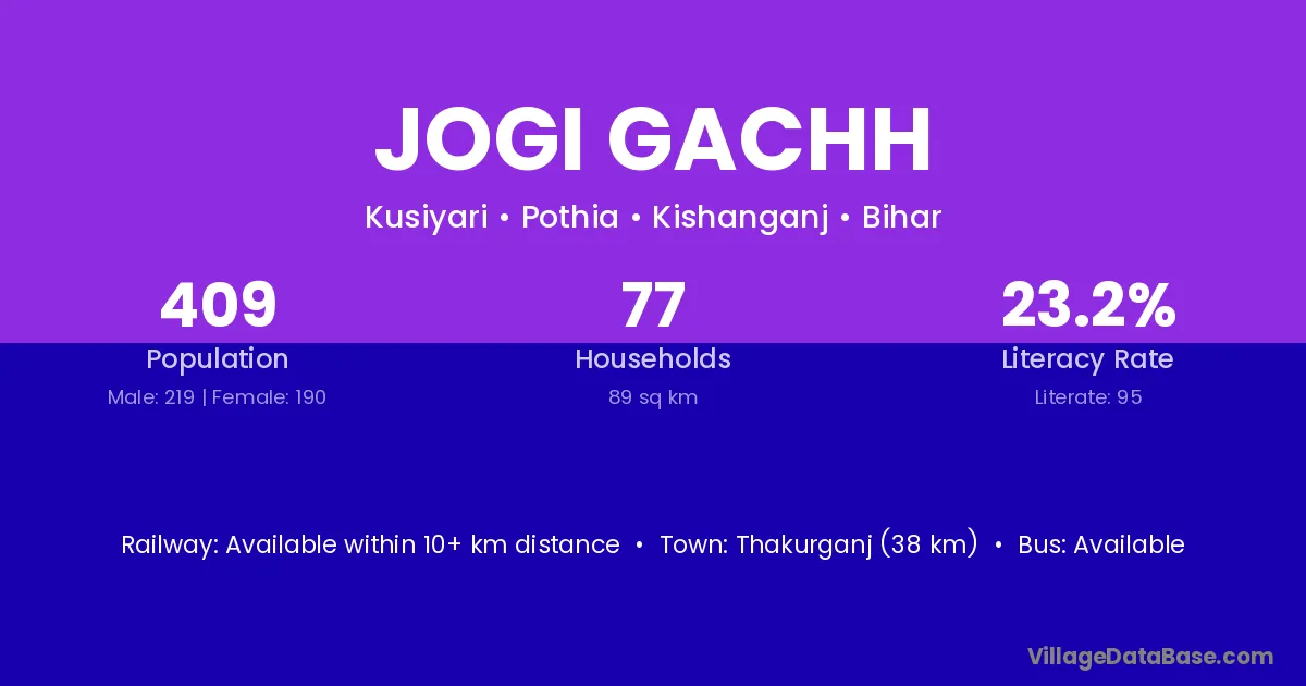 Jogi Gachh village has a total population of 409 people, of which 219 are males and 190 are females.