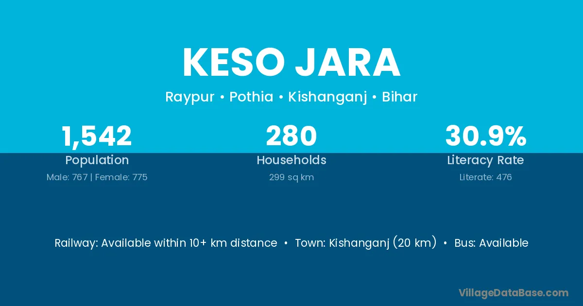Kishanganj (20 km) is the nearest town to Keso Jara village for major economic activities and is located approximately 20 km away.