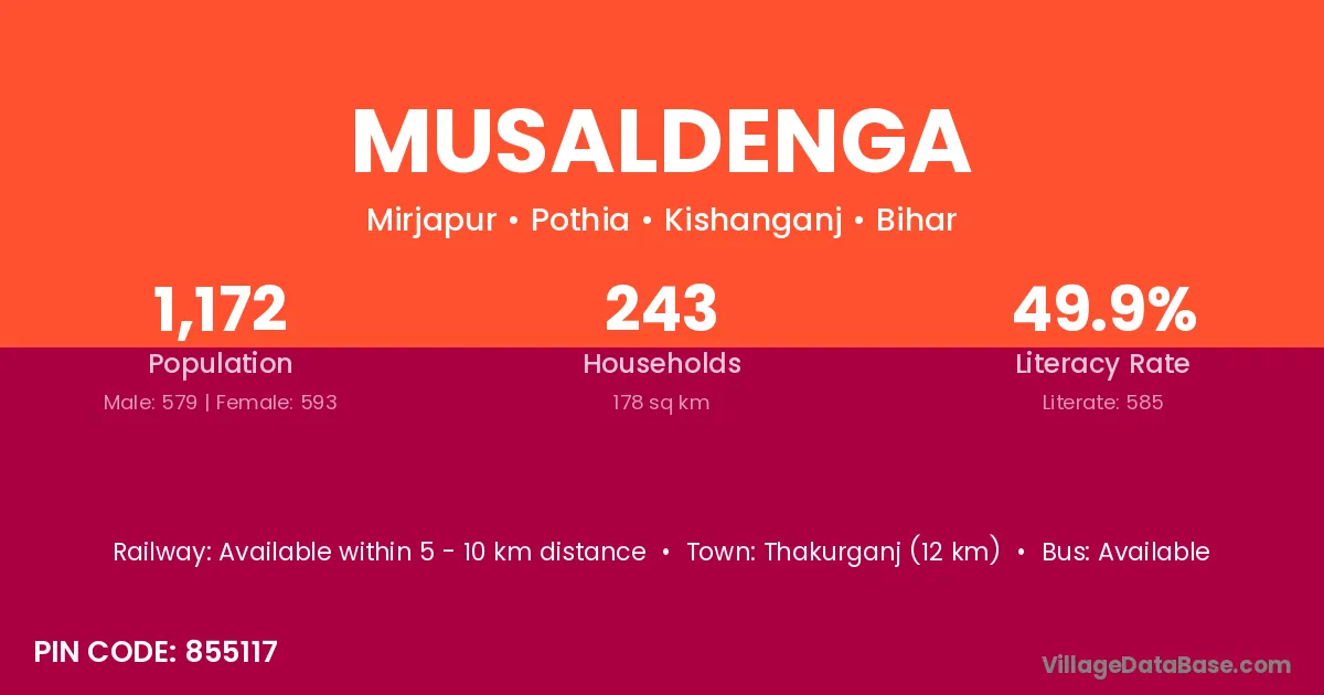 Thakurganj (12 km) is the nearest town to Musaldenga village for major economic activities and is located approximately 12 km away.