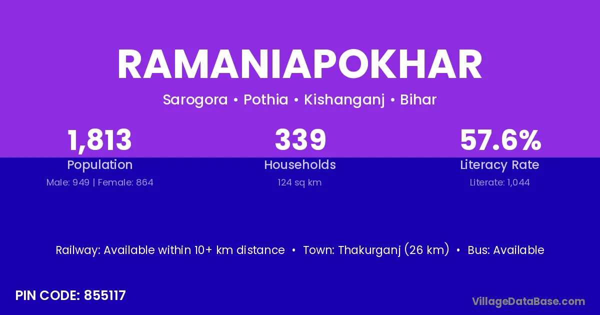 Thakurganj (26 km) is the nearest town to Ramaniapokhar village for major economic activities and is located approximately 26 km away.
