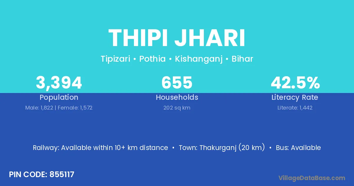 Thakurganj (20 km) is the nearest town to Thipi Jhari village for major economic activities and is located approximately 20 km away.