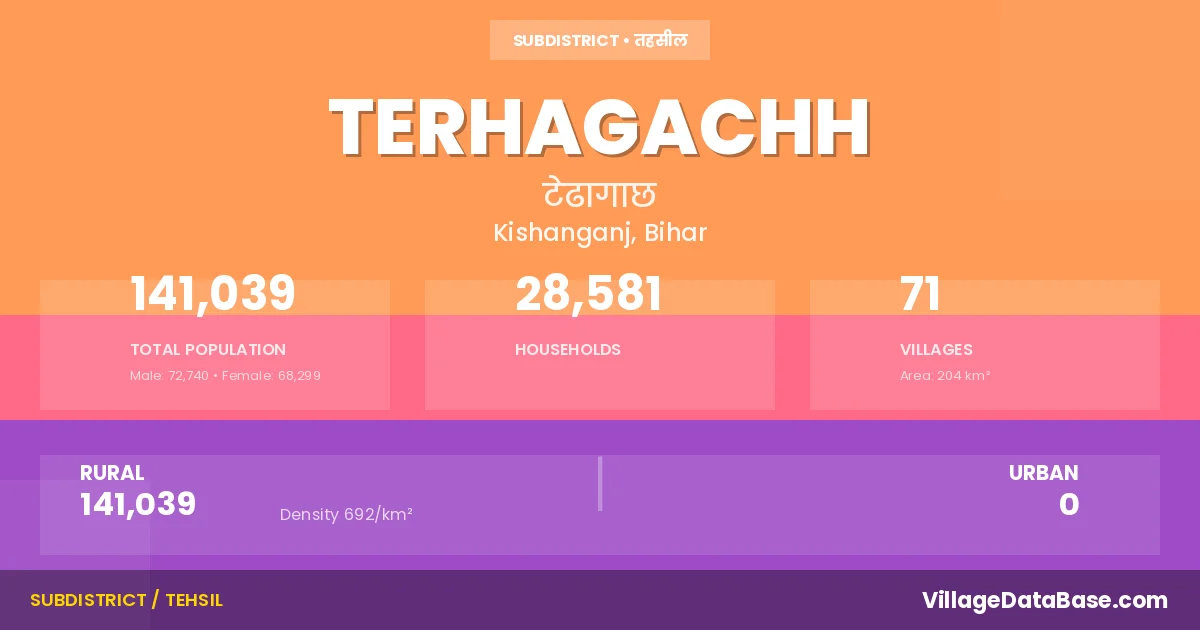 According to the 2011 census The total area of Terhagachh Subdivision is 204 km², with a population of 141039 people. The population density is 692 inhabitants per square kilometre, and there are approximately 28581 houses in the sub district.