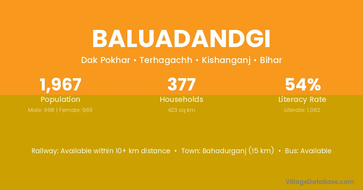 Bahadurganj (15 km) is the nearest town to Baluadandgi village for major economic activities and is located approximately 15 km away.