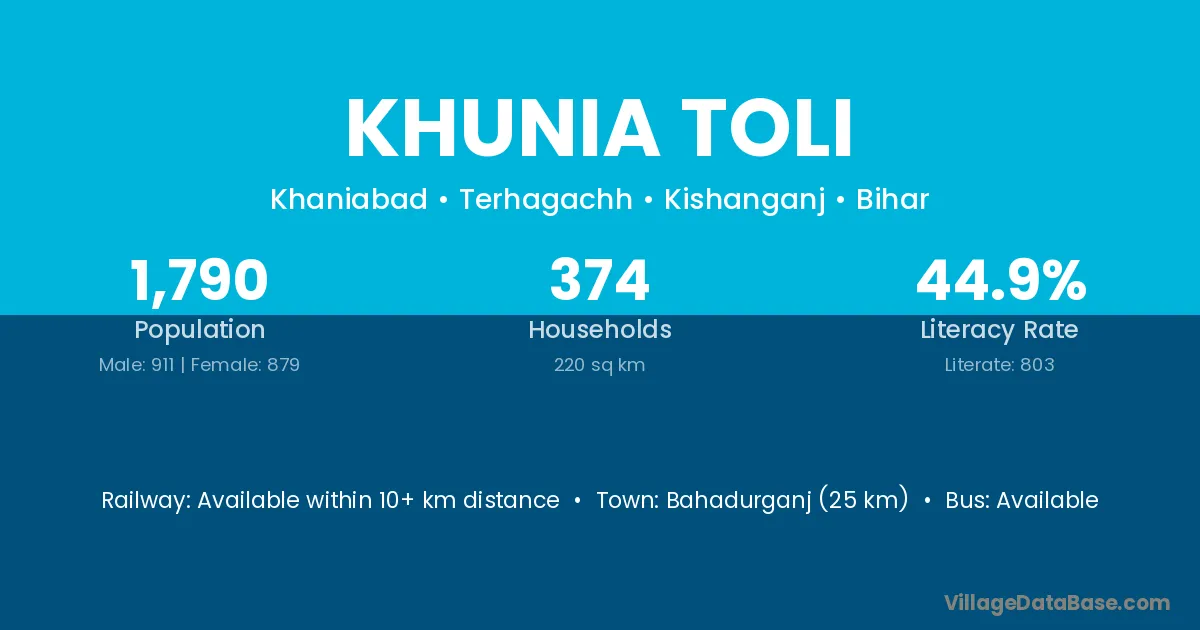 Khunia Toli village has a total population of 1,790 people, of which 911 are males and 879 are females.