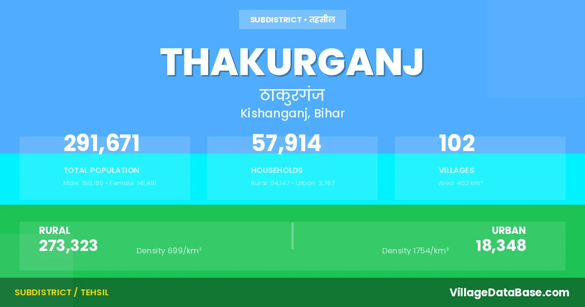 According to the 2011 census The total area of Thakurganj Subdivision is 402 km², with a population of 291671 people. The population density is 726 inhabitants per square kilometre, and there are approximately 57914 houses in the sub district.