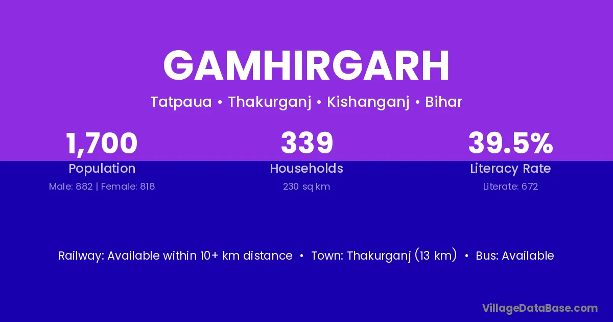 Thakurganj (13 km) is the nearest town to Gamhirgarh village for major economic activities and is located approximately 13 km away.
