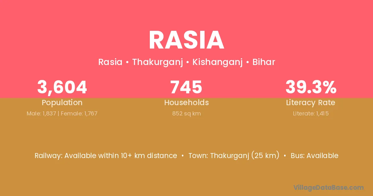 Thakurganj (25 km) is the nearest town to Rasia village for major economic activities and is located approximately 25 km away.