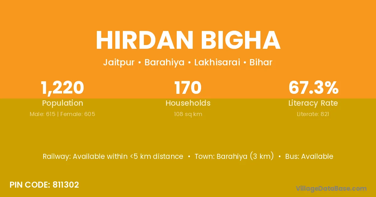 Barahiya (3 km) is the nearest town to Hirdan Bigha village for major economic activities and is located approximately 3 km away.