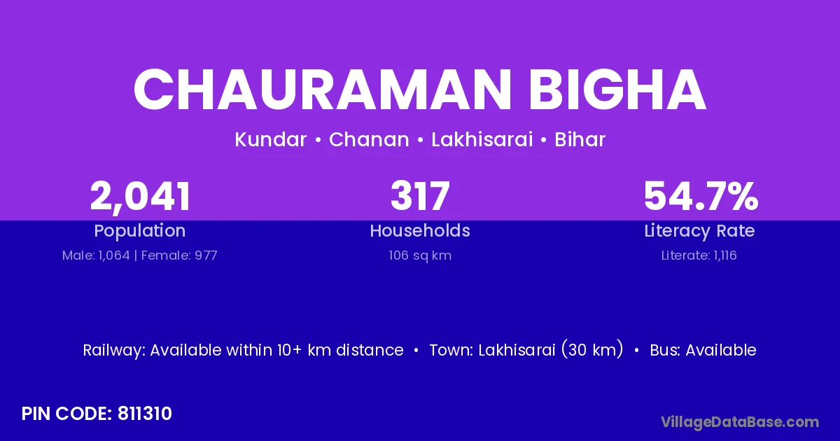 Lakhisarai (30 km) is the nearest town to Chauraman Bigha village for major economic activities and is located approximately 30 km away.