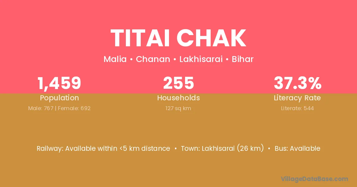 Lakhisarai (26 km) is the nearest town to Titai Chak village for major economic activities and is located approximately 26 km away.