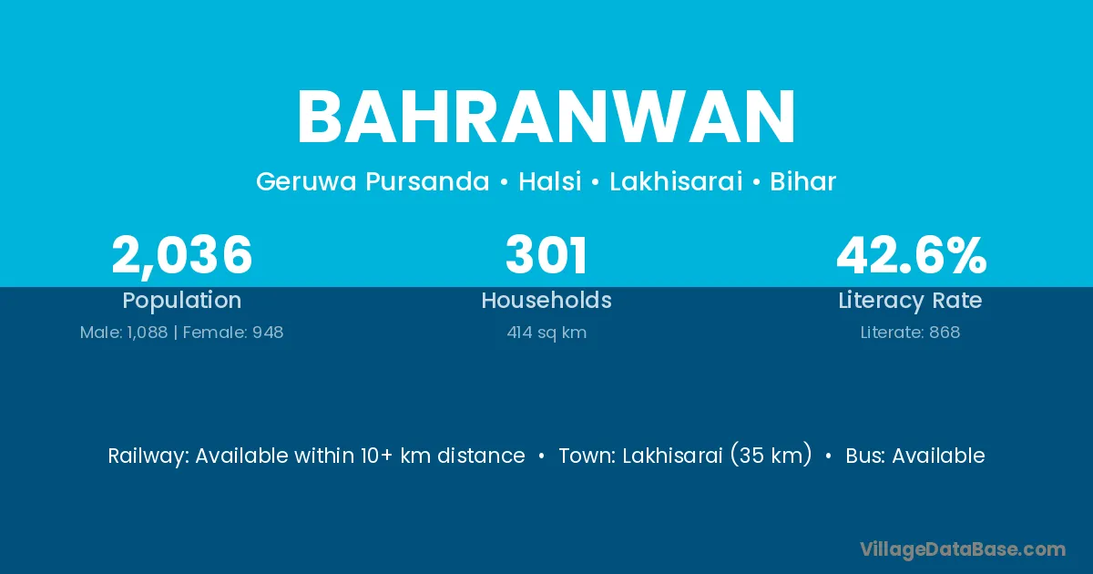 Lakhisarai (35 km) is the nearest town to Bahranwan village for major economic activities and is located approximately 35 km away.
