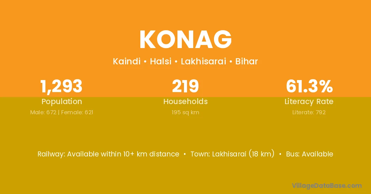 Lakhisarai (18 km) is the nearest town to Konag village for major economic activities and is located approximately 18 km away.