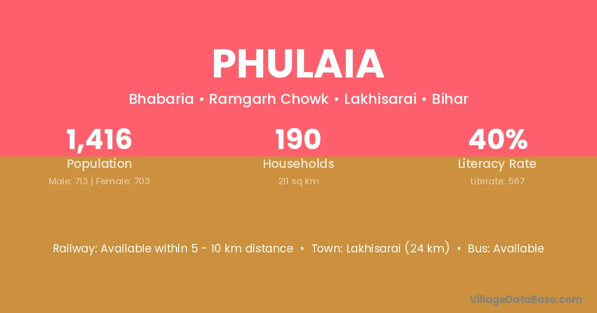 Lakhisarai (24 km) is the nearest town to Phulaia village for major economic activities and is located approximately 24 km away.