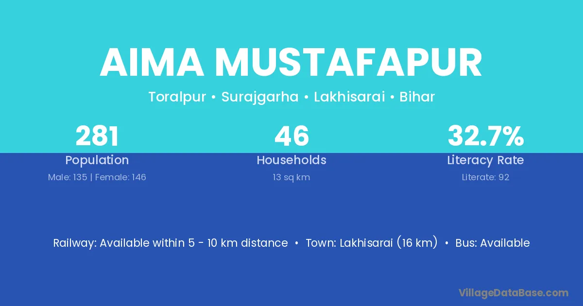 Lakhisarai (16 km) is the nearest town to Aima Mustafapur village for major economic activities and is located approximately 16 km away.