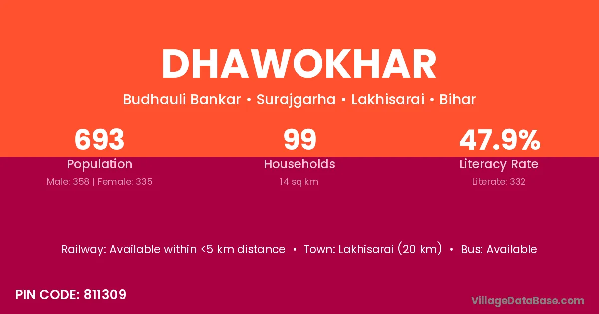 Lakhisarai (20 km) is the nearest town to Dhawokhar village for major economic activities and is located approximately 20 km away.