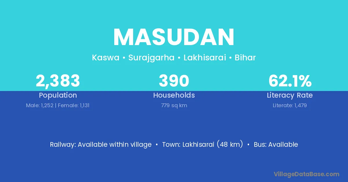 Lakhisarai (48 km) is the nearest town to Masudan village for major economic activities and is located approximately 48 km away.
