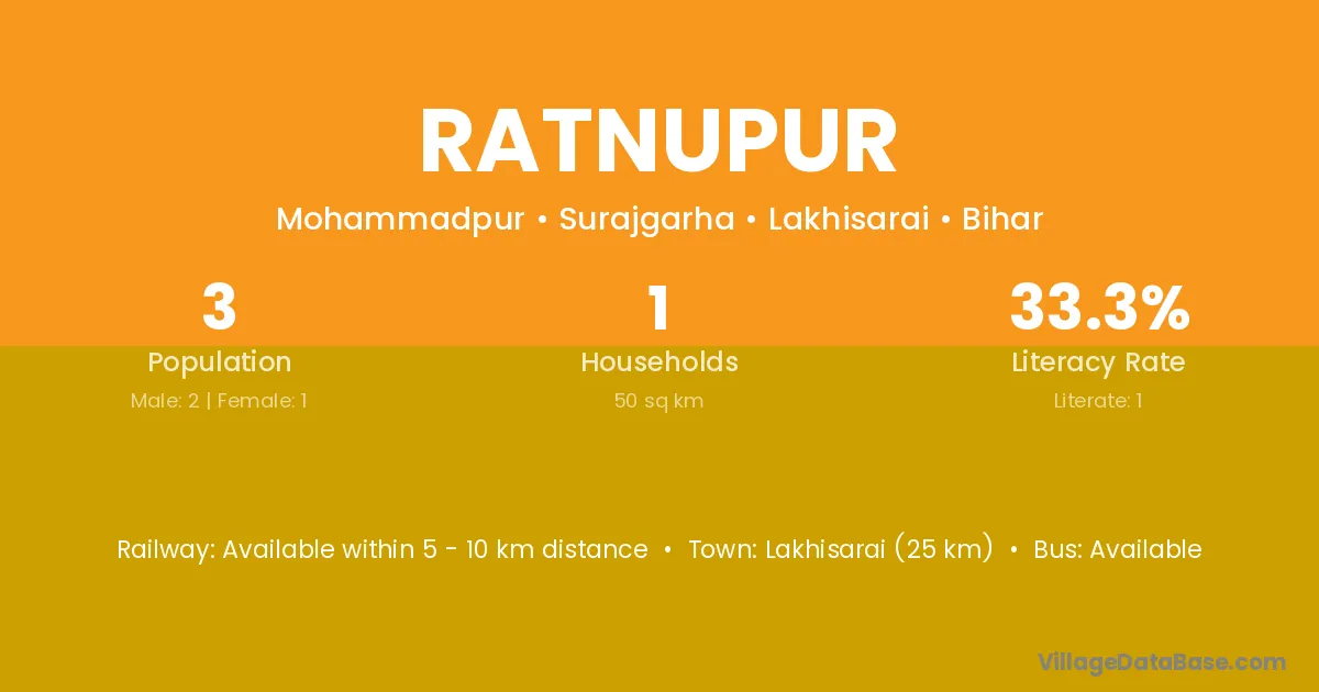Lakhisarai (25 km) is the nearest town to Ratnupur village for major economic activities and is located approximately 25 km away.