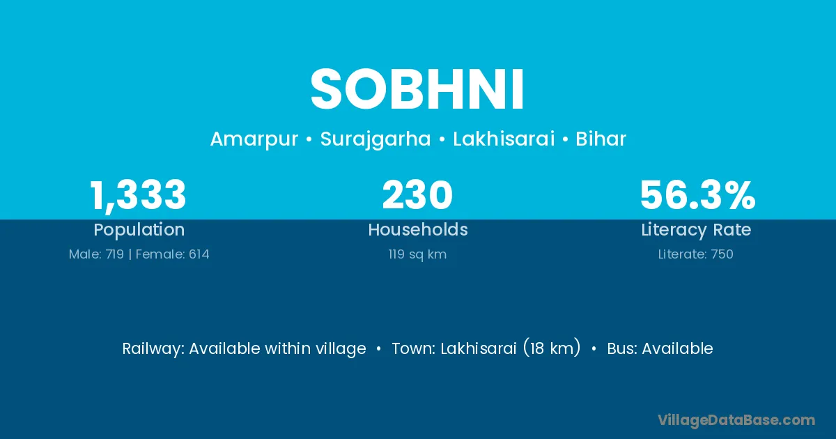Lakhisarai (18 km) is the nearest town to Sobhni village for major economic activities and is located approximately 18 km away.