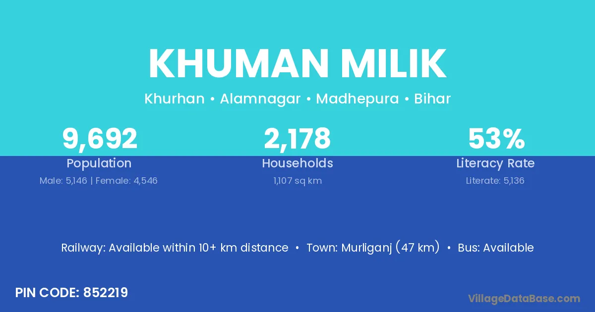 Murliganj (47 km) is the nearest town to Khuman Milik village for major economic activities and is located approximately 47 km away.