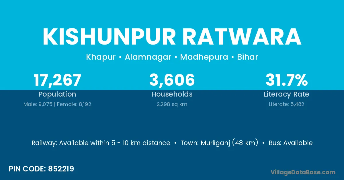Murliganj (48 km) is the nearest town to Kishunpur Ratwara village for major economic activities and is located approximately 48 km away.