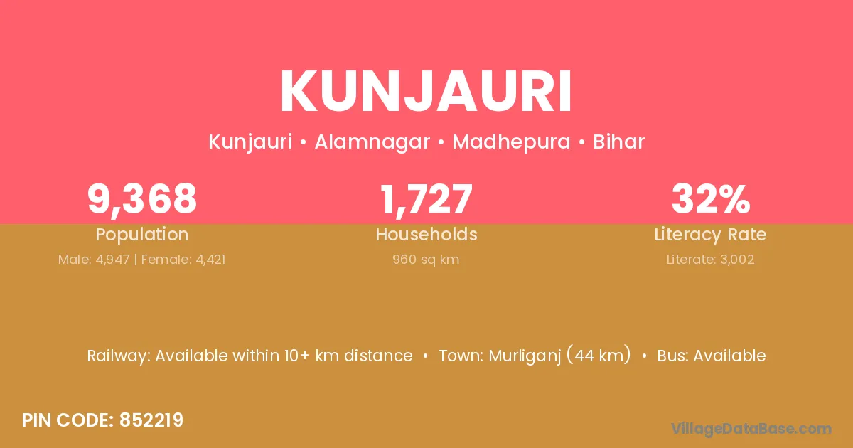 Murliganj (44 km) is the nearest town to Kunjauri village for major economic activities and is located approximately 44 km away.