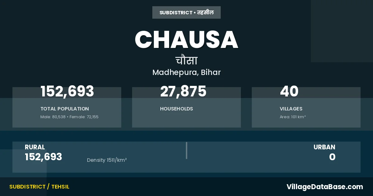 Chausa is a town and Subdivision in the Madhepura district of the Bihar. In India, a Subdivision is a subdivision of a district responsible for the administration and revenue collection of a specific area within the district. Subdivisions play a crucial role in the local governance structure, contributing significantly to the development and administration of their communities.