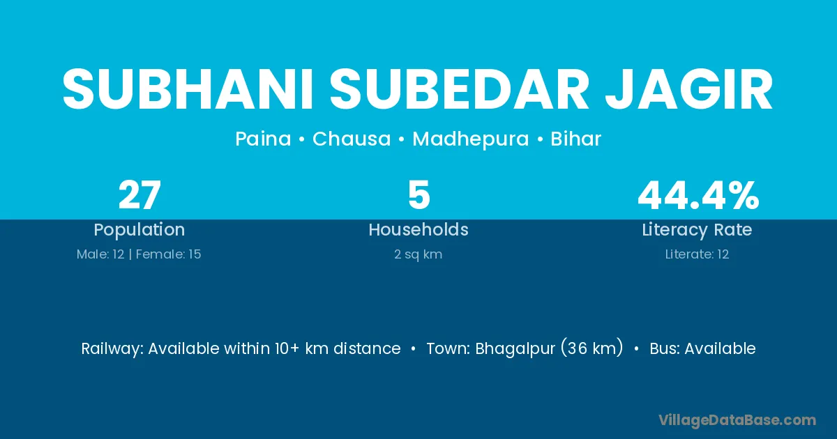 Bhagalpur (36 km) is the nearest town to Subhani Subedar Jagir village for major economic activities and is located approximately 36 km away.