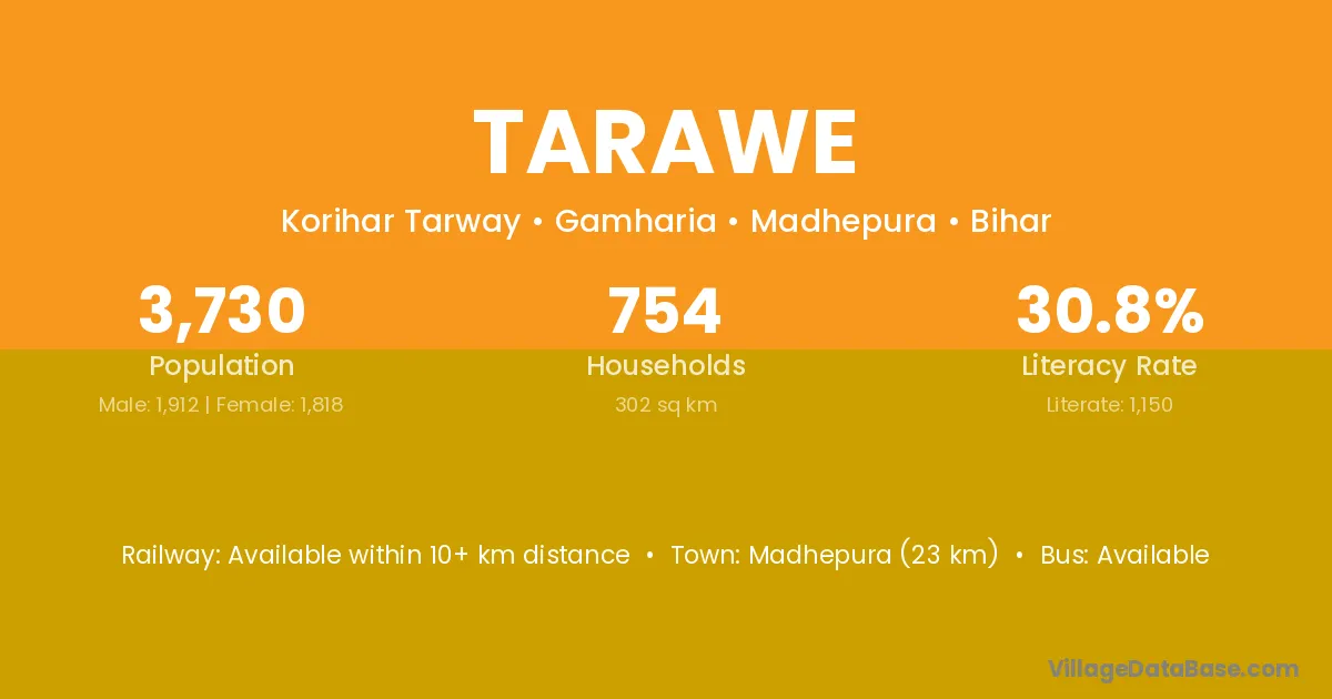Madhepura (23 km) is the nearest town to Tarawe village for major economic activities and is located approximately 23 km away.