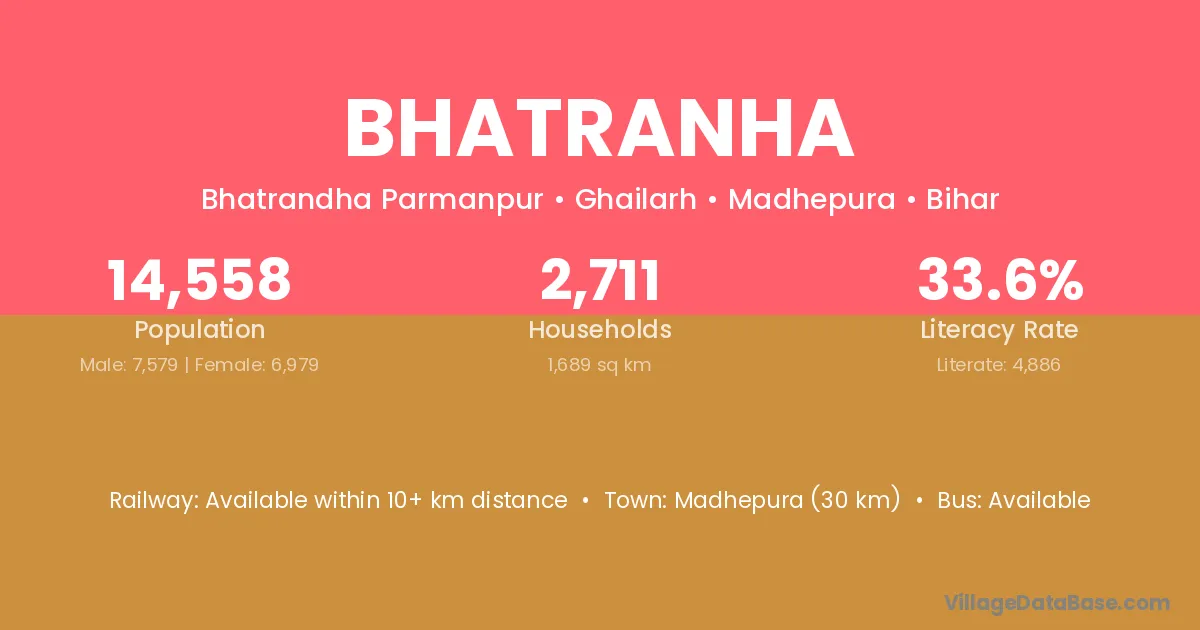 Madhepura (30 km) is the nearest town to Bhatranha village for major economic activities and is located approximately 30 km away.