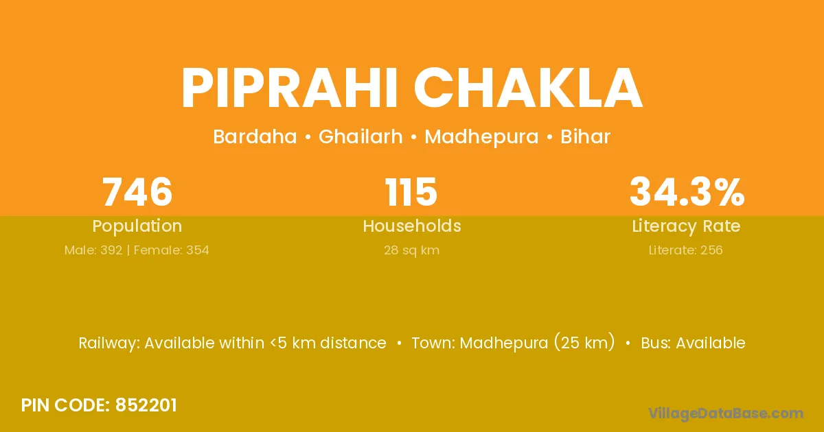 Madhepura (25 km) is the nearest town to Piprahi Chakla village for major economic activities and is located approximately 25 km away.