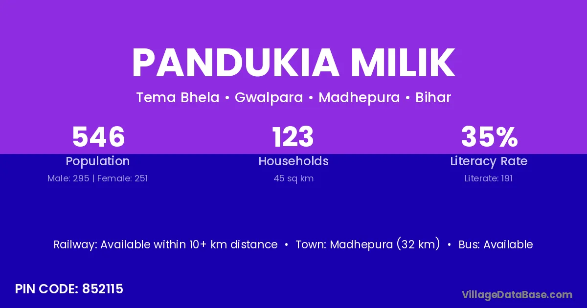 Madhepura (32 km) is the nearest town to Pandukia Milik village for major economic activities and is located approximately 32 km away.