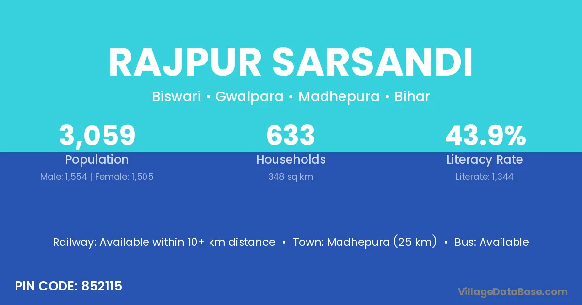 Madhepura (25 km) is the nearest town to Rajpur Sarsandi village for major economic activities and is located approximately 25 km away.