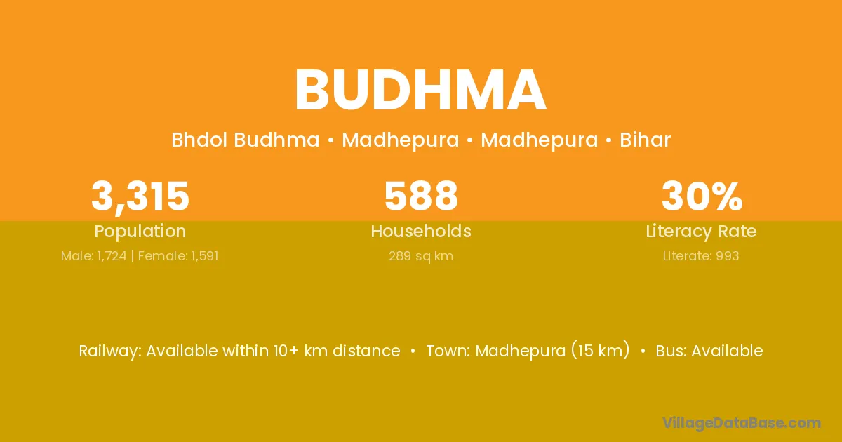 Madhepura (35 km) is the nearest town to Budhma village for major economic activities and is located approximately 35 km away.