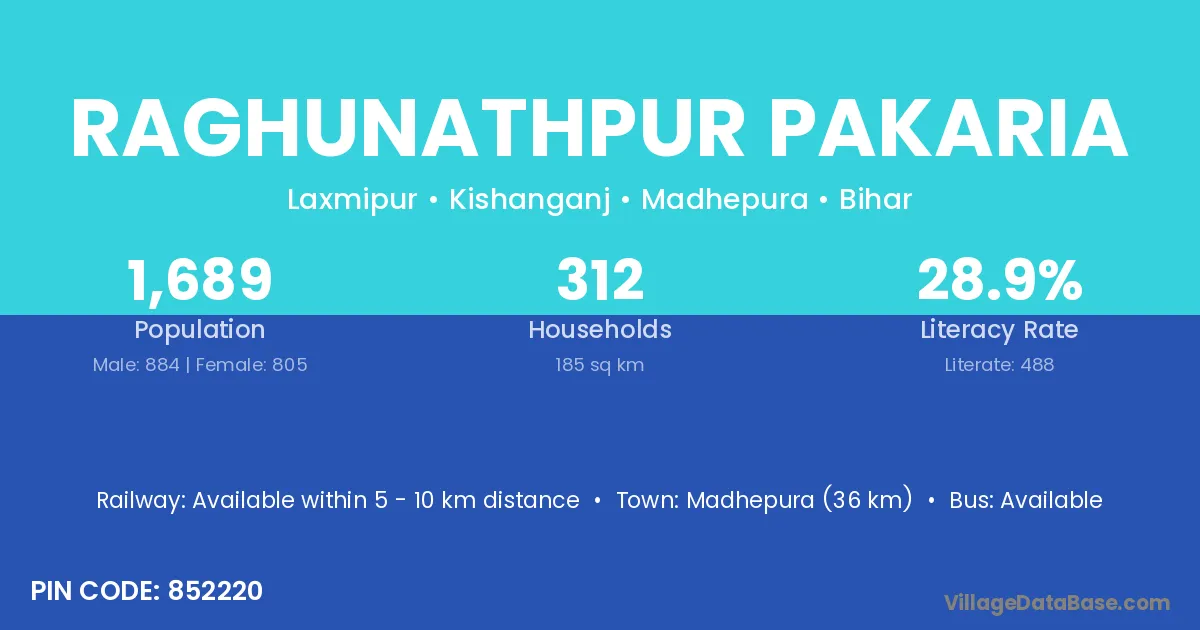 Madhepura (36 km) is the nearest town to Raghunathpur Pakaria village for major economic activities and is located approximately 36 km away.