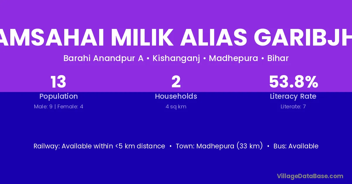 Madhepura (33 km) is the nearest town to Ramsahai Milik Alias Garibjha village for major economic activities and is located approximately 33 km away.