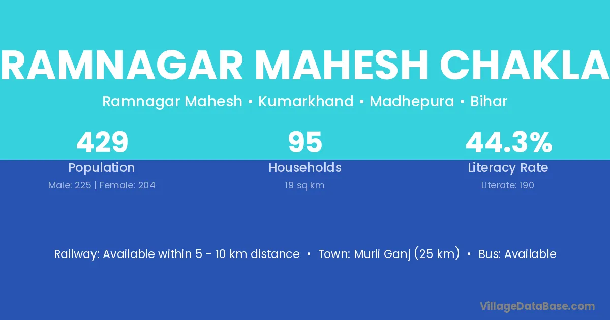 Murli Ganj (25 km) is the nearest town to Ramnagar Mahesh Chakla village for major economic activities and is located approximately 25 km away.