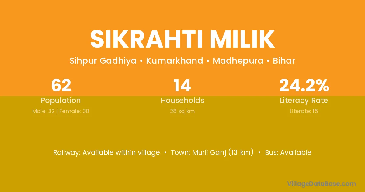 Sikrahti Milik village has a total population of 62 people, of which 32 are males and 30 are females.