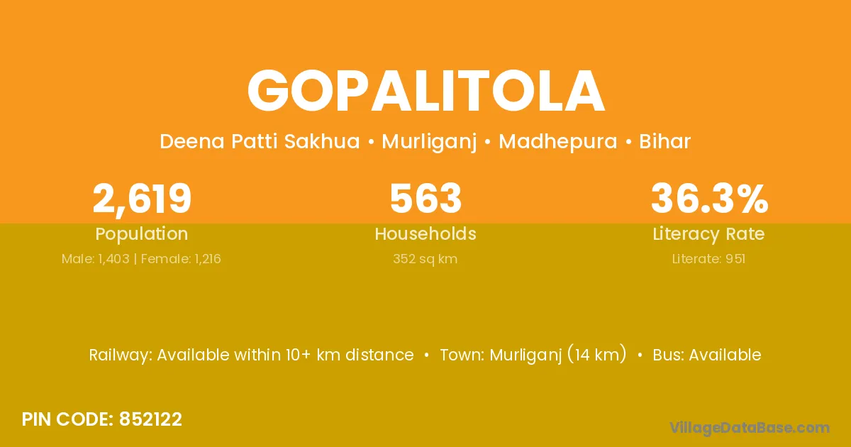 Murliganj (14 km) is the nearest town to Gopalitola village for major economic activities and is located approximately 14 km away.